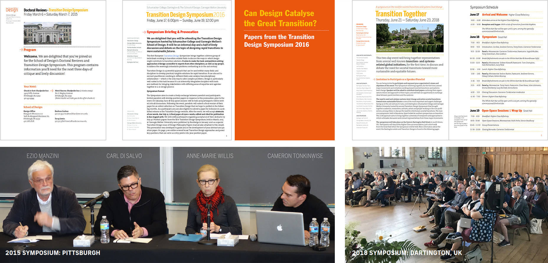 Each symposium combines presentations and panel discussions with participant-driven sessions. Open Space formats allow attendees to introduce topics, share research, and engage in dynamic exchanges. These events also invite paper submissions, with selected contributions published in printed proceedings: Design Philosophy Papers, 2015; Can Design Catalyse the Great Transition?, 2016; and Transition Together, 2018. This model ensures that the conversations extend beyond the symposium itself, generating resources for ongoing dialogue and scholarship.
